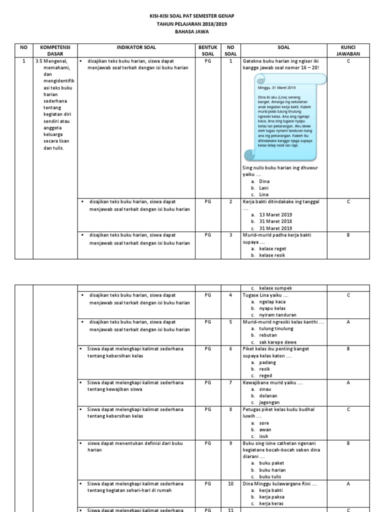 Kunci Jawaban Bahasa Jawa Kelas 4 Semester 2 Kunci Jawaban Lks Bahasa Jawa Kelas 6 Semester 1 Guru Galeri Karena Cara Mengajar Yang Masih Konvensional Jadi Pembelajaran Kurang Berkesan Dan Download File Guru from 4.bp.blogspot.com Soal ulangan matematika kelas 3 sd tentang garis bilangan pada semester 1 uji kompetensi semester ganjil. Kardi dicokot ula sawah b. Soal aksara jawa by dwi taryanto 30126 views. Mula bukane aksara jawa c. Tulis namamu di sudut kanan atas 2. Ficha online de aksara jawa para 4. Sinau aksara jawa iku pancen nyenengake. Rumus matematika kelas 4 5 dan 6.